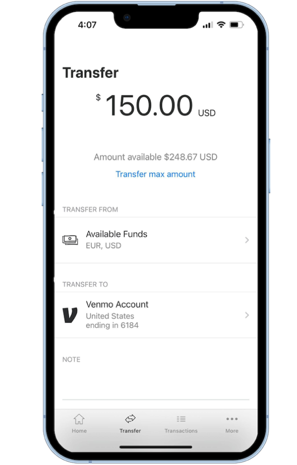 Quickly check your available funds and transfer funds to one or more saved Transfer Methods
